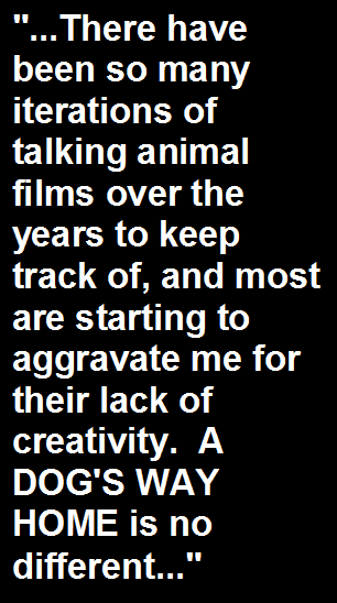 WAY HOME is no different and is one pure autopilot in this regard. That's the type of doggie movie I want to see...not A DOG'S WAY HOME. |