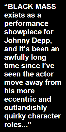 unnerving. If BLACK MASS were to have any faults then perhaps it would be in the area of its introduction of a multitude of characters (far too many to mention) that the screenplay kind of ignores and then reverts back to when necessary. There’s perhaps too much going on in terms of narrative bloat in the film, leaving BLACK MASS feeling like it could have benefited from an extra 20 minutes of so of running time. That, and key aspects of the film draws unavoidable comparisons to Scorsese’s THE DEPARTED, a more notable and frankly better portrait of Boston-centric crime. Nevertheless, Cooper excels at meticulously crafting a more cerebral and sobering take on the mob genre, one that places Whitey’s heinous criminal deeds front and center while juxtaposing them with the equally scandalous acts of the FBI that swept them under the table. BLACK MASS is uncompromisingly austere in its approach towards handling its fact-based story. Combining that with a fully reenergized and hypnotically enthralling Johnny Depp confidently leading the charge and you’re left with an absorbing and tension-filled gangster picture that will linger with you well after seeing it. |