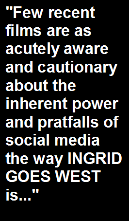 Social media is a fundamentally powerful force in modern culture, especially as a mass communication medium. However, it also has a decidedly macabre underbelly as a highly dangerous force of ill will when utilized by the wrong people, which is precisely the main message contained within the exceedingly bleak black comedy INGRID GOES WEST, which concerns a fanatically and clinically sick woman that goes well beyond normal means to become friends with another woman that she's been essentially stalking online via her Instagram page. Oftentimes as