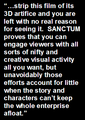 Dammit! SANCTUM is a frustrating experience at the movies. How many times have I put my hate on for the manner that Hollywood has taken mediocre to decent films – shot in standard 2D – and hastily given them shoddy 3D upconversions that are barely worth their three to four dollar movie ticket surcharge? Now