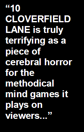 cerebral horror for the methodical mind games it plays on viewers. The film unfortunately seems to write itself into a corner in the final 30 minutes or so, during which time answers to our specific questions regarding the reliability of Howard’s story involving a chemical attack from either Russia or aliens are – without spoiling anything – specifically, yet dissatisfyingly answered. The final act somewhat devolves into the kind of perfunctory action thriller with explosions and large scale special effects that the previous two-thirds of the film were trying to avoid…and was frankly better off in doing just that. Despite its somewhat weakly engineered climax, I was nevertheless mightily impressed with 10 CLOVERFIELD LANE as a highly effectual, astoundingly well acted, and meticulously directed sort-of-sequel, but-not-really-a-sequel. Even more so than CLOVERFIELD, I found myself ultimately won over by this film’s extraordinary aptitude at segueing from preliminary unease and into full-out horror while utilizing a much smaller scale (the budget here was a paltry $5 million). 10 COVERFIELD LANE is nothing like CLOVERFIELD, which may leave many viewers hoping for a more direct follow-up entry in this series rather disappointed. For me, though, it’s the film's complete dissimilarity from the 2008 franchise entry that makes it a truly novel standout in an era of fairly witless and obligatorily paint-by-numbers sequels.
