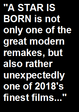 out stars in an instant that allows for Ally's success. A STAR IS BORN is not only one of the great modern remakes, but also rather unexpectedly one of 2018's finest films. Cooper persuasively hones in on the fragile and flawed nature of his characters, to the point where you find yourself easily invested in them while feeling great empathy for these damaged people, despite them being massively popular celebrities. And the whole enterprise, as a direct result, builds towards its three-hanky conclusion without feeling like it manipulatively pulled tears out of our eyes; this film earns its heartbreak. And in many ways, A STAR IS BORN is a breakout effort for Cooper as a director and Gaga as an actress to stand up and take notice of. With both of them triumphantly sharing the screen together in one of the more unlikely star unions in many a moon - and utterly carrying the film they occupy and taking a clichéd Hollywood tale and making it simmer with renewed interest - I was reminded that sometimes the best films are ones that sneak up and surprise you beyond your modest expectations of them.