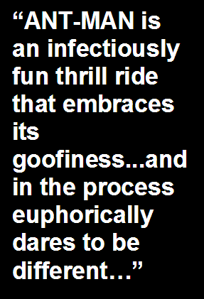 child’s room? ANT-MAN does stumble here and there along the way. The Scott/Hope relationship methodically hits every love/hate relationship arc that seems ripped from many a romcom. The script liberally borrows multiple elements from been-there, done-that super hero origin films (mad scientists once good, down-on-their-luck men seeking redemption as costumed crusaders, wise and old mentors that must train said men, yadda, yadda…). Then there is the big elephant in the room in the form of Edgar Wright – originally slated to direct the film, but departed due to creative differences (he still shares screenplay credit with Joe Wright, Adam McKay and Rudd) – and the large shadow he has cast over the production. Replacing him was Peyton Reed (DOWN WITH LOVE and YES MAN), a director that – akin to Rudd’s casting – seems like an odd fit for a major super hero summer tentpole film like this. Reed, though, deserves props for assembling his uniformly stellar cast and getting solid performances out of all them that intrinsically help ground all of the nonsensical lunacy that transpires around them. ANT-MAN is a very, very silly movie. But the makers behind and in front of the camera know that it’s very silly, which gives the film an inviting sense of self-deprecating charm. More importantly, ANT-MAN is an infectiously fun thrill ride that embraces its goofiness...and in the process euphorically dares to be different, something that seems hopelessly lost on many angst-ridden and grim super hero films these days. MY CTV REVIEW: |