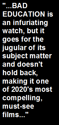 and performance economy. While watching BAD EDUCATION I was constantly reminded of Alexander Payne's 1999 film ELECTION (one of the greatest high school comedies ever made) in terms of both showing the desperate and self-serving crimes - in one form or another - of amoral teachers that were uncovered by students under them. Both films also showcase how teachers are capable of reprehensible behavior in their quest for empowering the youth of tomorrow. BAD EDUCATION is also a nice companion film to Finley's own THOROUGHBREDS, which also focused on well meaning characters that get taken down through some disturbing decision making vortexes. Both Tassone and Gluckin went to jail for years for their crimes, but - as a shocking end credits title card reveals - the former is still collecting a near $200,000 per year pension due to a ridiculous loophole in New York state pension law. How absurdly shameful. It's enough to make you want to throw something at the screen in disgust. BAD EDUCATION is an infuriating watch, but it goes for the jugular of its subject matter and doesn't hold back, making it one of 2020's most compelling, must-see films. |
