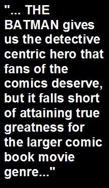 Cities in comic book movies never seem to stand a chance. There are a few other things that don't work as well as they should, like a hastily added on subtext about how The Riddler's dark web podcasts lead to the radicalization of angry white males (absolutely topical, yes, but they seem like an afterthought addition here). Nolan's BATMAN films did a finer and more nuanced job of placing the character in a post-911 milieu and worked far better as sobering commentary pieces about societal unease and uncertainty in an era of terrorism and economic depression. I think Reeves wants to go there with THE BATMAN, but seems a bit reticent to commit to the task, leaving his approach coming off as thematically half-hearted. Still, Batman here - thank the comic book movie gods! - is at least - and finally! - afforded to go full-on detective beast mode in a feature length film, and as an intoxicatingly scary crime thriller procedural THE BATMAN absolutely crushes it. Alas, Reeves and company only nail half of the Batman equation, and giving this winged caped menace more screentime than any of his previous versions has left Bruce Wayne this go-around (and his key relationships) feeling tossed to the sidelines. THE BATMAN, like the hero, is a film of ferocious drive, and it's a most welcoming reprieve from the sort of safe and secure committee-led creative sameness that has dogged many of the recent MCU films (if anything, the DC films as of late deserve high marks for nervy ambition). It also achieves the Herculean task of segregating itself well apart from the Nolanverse take on the hero and is undeniably visionary, despite its missteps. THE BATMAN gives us the detective centric hero that fans of the comics deserve, but it falls short of attaining true greatness for the larger comic book movie genre. |