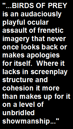 Still, BIRDS OF PREY is an audaciously playful ocular assault of frenetic imagery that never once looks back or makes apologies for itself. Where it lacks in screenplay structure and cohesion it more than makes up for it on a level of unbridled showmanship. And it's certainly not hard to root on these eclectic group of battle hardened women combining their unique forces together to brutally fend off and dispense the world of the men that have horribly wronged them. And they have a truly inspired ringmaster in the wide eyed and nuttier than a fruitcake Harley Quinn leading the charge. BIRDS OR PREY may not be everyone's cup of tea super hero team-up fare, but it deserves mad props for not slavishly playing up to the repetitive sameness of oh-so-many other genre efforts. It's a glitter shotgun blast to the face as only Harley Quinzel could imagine. |