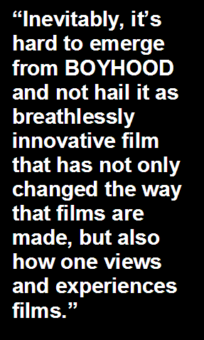 This is a work that will be talked about for years. The Austin-born Linklater has made a career of focusing on the microcosms of his everyday characters (from his introductory effort SLACKER to his 1970’s high school comedy DAZED AND CONFUSED to his BEFORE trilogy), but nothing on his past resume matches the sheer scope, ambition, and raw courage of his aesthetic choices in BOYHOOD. In order the cover the vastness of his main character’s story, Linklater has the same actor portraying the main character from his childhood to late teens. That’s right. No special effects. No