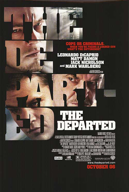 2006, R, 150 mins. Frank Costello: Jack Nicholson / Billy Costigan: Leonardo DiCaprio / Colin Sullivan: Matt Damon / Madeleine: Vera Farmiga / Oliver Queenan: Martin Sheen / Dignam: Mark Wahlberg / Ellerby: Alec Baldwin Directed by Martin Scorsese / Written by William Monahan, based on the film INFERNAL AFFAIRS. |