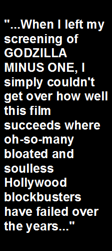 Unfortunately, things are no better for him upon his return to his mostly bomb-flattened city. His community, home, and remaining family have been hopelessly wiped out. He's all alone and with little hope for the future. As he walks through the rubble of Tokyo, he has a chance meeting with Noriko (Minami Hambe), another fellow survivor who is caring for a baby that has lost her mother and father during the war. Slowly, the pair find ways to bond out of survival necessity, and as the months and years go by, they decide to raise the baby - now a child - Akiko (Sae Nagatani) together as platonic partners. Koichi also takes up a job on a sea vessel combing through the ocean for leftover war mines (mostly out of survival guilt for not committing to his duties in the war). A much more fully formed and dangerous Godzilla emerges from the ocean and makes it on land and unleashes even more devastation on an already war-devastated Japanese city (it appears that the monster evolved further via U.S. nuclear tests at Bikini Atoll). Realizing that Godzilla needs to be stopped to save Japan and the world (and without having much in the way of outside nation aid), elements of a ragtag Japanese government and military launch an ingenious plan to stop Godzilla, quarterbacked by one of Koichi's new friends and allies in an ex-weapons engineer, Kenji Noda (Hidetaka Yoshioka). Part of the greatness of GODZILLA MINUS ONE is how it uses kaiju for social commentary and metaphor. Of course, past GODZILLA films have done so as well, but not to the same emotionally gut-wrenching level as on display here. Witnessing post-war Japan at its most futile and when hope is a nearly unattainable luxury hits profoundly hard in this film's opening sections (it also wisely reminds viewers that - in any war - there are innocent people one both sides that suffer in incalculable ways). The manner that Yamazaki makes his GODZILLA simmer with ample dread and dives headfirst into themes of war, death, loss, and survival is noteworthy. The epic scaled action sequences that we come to expect out of films like this do come, but Yamazaki trusts the patience levels of his audience and allows us to get into the traumatized headspaces of his characters first and foremost. Koichi and Noriko have lost seemingly everything because of the war, but they cling together in an effort to rebuild a new life and raise Akiko as one of their own. Godzilla almost becomes a frightening manifestation of post-war hopelessness and fear in these people. They have all gone through hell and back...and now they have to go through it again (and then some) with this creature making its presence felt. And I cared for Koichi and Noriko. I can honestly say that I didn't feel the same about any of the other characters in other recent Godzilla pictures. GODZILLA MINUS ONE embraces its well-nurtured human drama and reminds us why films of this ilk desperately need some heart and soul infused into them. This film is a lot darker and more depressing than I remember any other GODZILLA film being, mostly because it shows us in harrowing detail how both WWII and the creature have wreaked such unspeakable horrors on normal people hopelessly caught in their path. Koichi's arc is fascinating in the sense that he technically failed as a kamikaze pilot in order to stay alive and is then burdened with guilt and shame for his perceived inadequacies as a soldier pilot (many back home in Tokyo lambaste him when he returns). The intense shame he experiences drives him into a surrogate parental role with Noriko, during which time he gets to experience a return to some form of family normalcy back home. And then, just when he has attained a form of peace, Godzilla appears and threatens not only his new partner and child, but the Japanese as a whole. This springs Koichi back into action with a newfound patriotic fervor to eradicate this new enemy...or die trying. Throughout the entirety of GODZILLA, I was locked into this character's challenging arc and willing to go anywhere with him. As for the Godzilla action itself? This film delivers...oh...does it deliver. The monster has been presented in everything from men in rubber suits to CG creations (some good - like in Gareth Edwards' GODZILLA - and some awful - see Roland Emmerich's 1998 GODZILLA), but here he's legitimately more panic-inducing and menacing than ever before. He's ferociously unhinged and the furthest thing away from being a protector of humanity. In essence, he's a merciless killing machine. When this colossus finally unleashes his atomic breath, it instantly levels vast chucks of a city, kind of akin to the A-bombing of Hiroshima (definitely an uneasy experience to have to go through again for these people). What truly blew my mind while watching GODZILLA MINUS ONE is what Yamazaki (also serving as VFX supervisor on top of his directing and screenwriting duties) achieves on screen here with a reported $15 million budget, which might not have covered the catering on GODZILLA VS KONG. We get completely convincing shots of Godzilla in water...or mowing his way through cities...or (as is the case in the film's opening) stomping and biting his way through Japanese soldiers. The sheer scope and scale of this film is staggering considering its relatively miniscule budget, and it confidently holds up to any recent American Godzilla film that cost upwards of ten times more. This is one of the most impressive technical cinematic achievements (minimal resources or not) of recent memory, all things considered. Everything builds to a spectacularly suspenseful grand finale that props up scientists like Kenji (with Koichi figuring in heavily in another crucial role) into a heroic prime leadership position who uses a keen knowledge of psychics to unleash a compelling plan to kill this monster (it's equal parts crazy and scientifically sound). I love it when a monster film isn't mindless and instead blends state-of-the-art visuals, fan