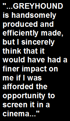 the actor. It sounds like I'm being pretty negative in the closing sections of this review. Beyond what was just mentioned, GREYHOUND's overall approach does feel antiquated at times and seems like it's appropriating the style and tone of war films of yesteryear. I don't typically like to use the moniker of "old fashioned" in the pejorative sense, but it kind of fits here. Compared to many other great WWII films, GREYHOUND is a bit too muted and vanilla plain for its own good, not to mention that if you want to watch a truly masterful navel thriller also featuring Hanks embodying a military man of action that exudes courage under fire then seek out the infinitely superior CAPTAIN PHILLIPS. Still, GREYHOUND is handsomely produced and efficiently made, but I sincerely think that it would have had a finer impact on me if I was afforded the opportunity to screen it in a cinema. The film was another casualty (a frequent descriptor in my reviews as of late) of the pandemic, and was optioned for screening on Apple TV+ (even with my not-so-inconsiderable home theater setup, GREYHOUND'S visual and auditory impact would have made for a greater experience in cinemas). If anything, it's the kind of film that positively reminds us why it would be shameful if cinemas died altogether in the wake of COVID-19 in favor of home streaming. GREYHOUND deserves giant screen treatment, not home consumption or - God forbid - tablet viewing. Newfangled ways to watch films will never replace good - ahem! - old fashioned cinemas. |