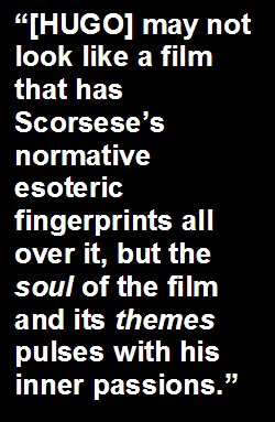 HUGO is a family entertainment that is true feast for the eyes and engages audiences on a primal visual level. Yet, it also transfixes viewers in a touching and sentimental narrative that, in turn, deals with its director’s own pet causes. How many films like it manage to be such a delightful coming-of-age fable while championing the real life birth of the movies? Children will assuredly be taken in with the visual majesty of the whole production, but adults will perhaps come out with a newfound appreciation for movie-making lore and its tireless innovators that have largely gone unsung. Because of the latter sentiment, HUGO is, in many ways, Scorsese’s most profoundly personal film of his career. |