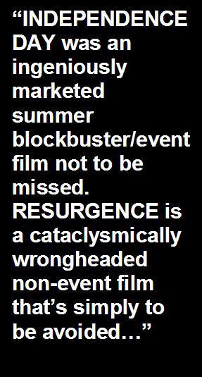 I enjoyed the brainless exuberance of ID4, but RESURGENCE is such a dislikeable, dull, soulless, incompetent, and ultimately unnecessary