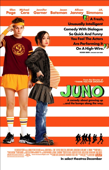 The film opened to great word-of-mouth when it had its world premiere at the Telluride Film Festival in September of 2007 and then went to Toronto, where it became a small sensation. And for good reason: There is not one phony, contrived, wrongly sentimental, predictable, or false second in this film. It contains what has to be one of the sharpest, smartest, and most perceptively written screenplays of any recent American comedy and a towering-above-all-others performance by Ellen Page, who seems destined for great things...like walking up to an Academy Awards podium. People have been talking about this Maritime-born Canadian actress in this film, which is already generating huge Oscar buzz. Many may remember her from her brief stint playing Kitty Pryde in the last X-MEN film, but her true breakout performance was in last year’s shockingly tense HARD CANDY, where she played a 14-year-old girl that used her intelligence and tenacity to capture a pedophile and subsequently tied him up, tortured him, and threatened to castrate him. The character in that film was easily one of the most difficult and polarizing of the year, but Page demonstrated a confidence, poise, and maturity that actors twice her age can’t muster. I called her my breakout star of 2006 for that film. JUNO all but solidifies her status with the acting elite. Both Page and another marvelous and young up-and-coming actor, Ryan Gosling, are starting to seriously reveal how the finest new actors are coming from the Great White North. She was on David Letterman the other night. What’s kind of astonishing about her is that she is such an articulate, sharp witted, pretty, and astute 20-year-old. If there is a character that is as flawlessly cast as any, then Juno has to be one. Page is able to effectively and convincing play a lot younger than she is (Juno is 16-years-old in the film), and is easily able to relay this character’s incredibly verbose, intelligent, acerbic tongued, adorable, and confident personality while, most importantly, her insecurities and faults. Most screen comedies don’t have the time to present its lead character in this broad of a spectrum and instead try to pass them off in simplistic strokes. If anything, it’s the combination of Page’s hilarious and touching performance and Diablo’s Cody’s brilliantly dry, literate, and engaging screenplay that makes JUNO one of the best American comedies I’ve seen in awhile. If Quentin Tarantino, Kevin Smith, Woody Allen and John Hughes all teamed up and contributed snippets to a script, then JUNO would be the result. What’s astounding about the screenplay by Cody (an amazing story in its own right; she was a stripper turned screenwriter) is how real the words feel coming out of the actor’s mouths. She is incredibly shrewd about nailing the idiosyncrasies of everyday speech: Her characters in JUNO engage in scene after scene of dialogue exchanges that are colorful, pop cultured referenced, and emotionally frank and to-the-point. There is a joyous lack of weighty pontificating in the ways the characters talk to one another, and Juno in particular is kind of a lyrically cocky and sarcastic teen that enunciates in a dry, Generation X-er slacker talk that has a rhythm and odd poetry about it. It’s also wickedly funny. When her friend asks her if she is sure that she is pregnant or if it’s just a "food baby," Juno responds, "This is not a food baby, all right? I've taken like three pregnancy tests and I am for shizz up the spout." The film is ripe with great banter like that, and Page and Cody turn Juno into one of the most inspired creations on the silver screen in many a moon. "It all started with a chair" Juno explains in the film’s voice-over at the beginning of the film. She has made one of the hastiest decisions of her life by having sex with her best friend, Paulie Bleeker (played by another great young actor, Michael Cera, more on him later) in the recliner of her parent’s basement. Juno is your average teenage girl: She has a huge love of gross-out horror films and punk music (she adores Patti Smith, Iggy and the Stooges, and The Runaways), plays a Harmony guitar in a band with Bleeker, and - like most other adolescents - she’s a smart ass, but in her case she’s a very well spoken and...well...smart smart ass. However, her largest fault is also her greatest strength: She thinks she’s as wise and all-knowing as the adult figures that populate and surround her world, which makes it painfully difficult for her to take any real advice from anyone over 30. This, of course, only frustrates her attempts in the film to have one simple question answered for her: Can two people who love each other spend an eternity together? How could she know the answer herself. At one point she pitifully states, "I don’t know who I am." As Juno’s once virginal lover and best friend, Bleeker is a interesting foil to her. Whereas she’s rambunctious and boisterous, he’s shy and timid. He’s a pasty-white skinned, skinny Jewish track runner that seems to be, in every scene of the film, wearing gold track shorts (which Juno hilariously discusses are designed to show a boy’s "junk" flailing away as he runs). He also is addicted to eating Tic Tacs with the compulsion of a heroin junky. Bleeker loves Juno, despite all of her faults, but Juno thinks that his love has been precipitated by their fling in a recliner. Of course, Juno tells Bleeker the news, which horrifies him. She then tells her father (played in great performance by J.K. Simmons) and her step-mom of ten years (the equally fine Allison Janney). The great thing about the film is that the parents are not mournfully reduced to uncaring and falsely ignorant stooges in Juno’s life that has punctuated too many dumb teen comedies in the past. These parents are wiser and perhaps smarter than Juno, and they also are just as acid-tongued. When Juno leaves the room the step-mom tells dad, "You kn