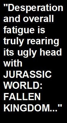 at the screening I attended. By the time JURASSIC WORLD: FALLEN KINGDOM ended my neck was sore from all of the head shaking. This is a sequel that wants to be a sophisticated piece of sci-fi about grand ideas and instead lacks the wherewithal to deal with them in engrossing ways. Unconstructively, the film - like its last few prequels - falls back on mindless cat and mouse action and scares, but even those scenes here lack a sizeable and lasting bite; this is the most bloodless and least frightening of all the JURASSIC PARK entries. Desperation and overall fatigue is truly rearing its ugly head with JURASSIC WORLD: FALLEN KINGDOM, and it's becoming abundantly clear that the sense of sweeping majesty and fascination that Spielberg drummed up in these mythical creatures 25 years ago is now in egregiously short supply. Alas, and to paraphrase Dr. Malcolm, life - and cynically brainless sequels looking to cash in and make a buck - finds a way. Oh, how the once mighty have fallen. |