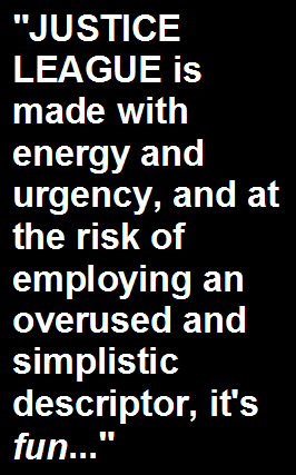 LEAGUE will undoubtedly have trouble making those connections. And despite the fact that JUSTICE LEAGUE has neatly trimmed the monotonous fat off of its running time, I still would be interested to see a longer cut of this film that allows the many of these new characters more thorough and meaningful introductions that don't feel a tad rushed out of the gate. Yet, you still have to kind of admire how nimble footed Snyder's and Whedon's approach to the material is here, diving headfirst into multiple origin stories and giving us all of the core details we need to know about them with minimal fuss (and in less than two hours, which is thanklessly commendable). More importantly, JUSTICE LEAGUE is made with energy and urgency, and at the risk of employing an overused and simplistic descriptor, it's fun and has its heart in the right place. This is not a transcending piece of super hero filmmaking (if anything, the makers here play everything achingly safe), but its aims were to course correct the DCEU into something more inviting and purely entertaining. On those basic levels, JUSTICE LEAGUE accomplishes its own end game and is a modest success. And while watching the entire team strike a victory pose at the film's climax it was awfully hard for the cold hearted 42-year-old film critic in me not to crack a smile like a wide-eyed 10-year-old.