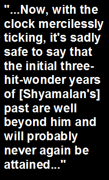 attained at one point, but then it just goes on and on...and on. Shyamalan simply can't help himself. I hope that relative metric makes sense, because so much of this movie doesn't |
