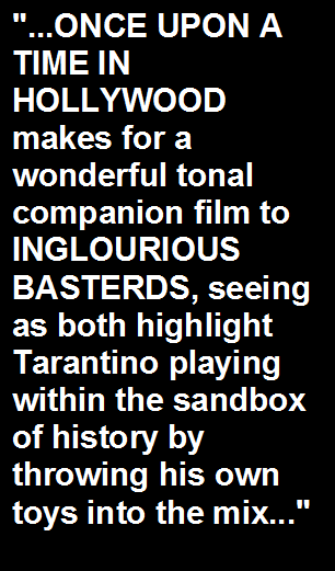 throwing his own toys into the mix. I was so ultimately taken in with Tarantino's audacious choices in ONCE UPON A TIME IN HOLLYWOOD, joyously morphing fact and fiction, that it made it difficult for me to overlook some of his film's obvious faults, like its self indulgent and bloated running time. At nearly three hours, this is an indefensibly long film that both purposely feels leisurely at times and unwieldy and undisciplined in other sections; the biggest sin of this film is it's lack of editorial discipline. Still, there's so much bloody happening in ONCE UPON A TIME IN AMERICA that it's also hard to fault Tarantino, and his second last feature film (if we are to believe his promise to quit after his tenth) has more unbridled ambition and unfettered gumption that just about every other film that hits the multiplex during the summer film season. Most importantly, you sense Tarantino's undying passion for the material and time period in every shot and sequence, and even though his film builds towards shocking and bombastic violence, he somehow ends it all with a hint of nostalgic idealism and feel good hope. He gives the Golden Age of Hollywood the Hollywood storybook ending it deserves, but didn't get. And there's not many other directors today that could have worked with as many ingredients that ONCE UPON A TIME IN HOLLYWOOD throws into the mixing bowl and somehow stirs it all together with such bold fluidity. |