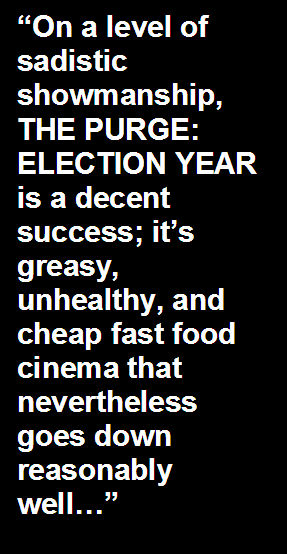 THE PURGE: ELECTION YEAR – the improbable third film in the improbably popular futuristic sci-fi/survival/horror series – is absolute trash. But it’s highly entertaining and reasonably well oiled trash. I’m
