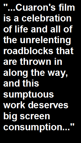 wounded heart. My biggest takeaway with ROMA is how truthfully it displays domesticity and how it takes its time to showcase Cleo's own personal story unfold, which has multiple psychological scars to uncomfortably bare. Even when she has to deal with soul sucking tragedies in her life, she nevertheless finds the inner resiliency to still emerge as a guardian to Sofia and her children, and it's that sense of the larger themes of loss, sacrifice and protection that make ROMA so utterly beguiling. Cuaron's film is a celebration of life and all of the unrelenting roadblocks that are thrown in along the way, and this sumptuous work deserves big screen consumption. And yes, this is a Netflix produced and released endeavor, but ROMA represents - more than any other film from 2018 - a work that deserves to be actively experienced in a cinema if possible. I couldn't imagine, for the life of me, losing myself in Cuaron's magnificent achievement on a small TV screen or - God forbid - on a smart phone or tablet, as doing so would rob ROMA of its enrapturing power. |