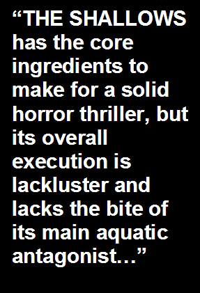 circumstances. Miraculously, Lively is up to the performance challenge of elevating herself well above the mechanical nature of the scripting and delivers a focused, committed, and empowered performance that does command our attention for the film’s 87 minutes. You totally buy into her paralyzing fear and anxiety. I just wished, though, that THE SHALLOWS was…more teeth-clenchingly scary. And yes, the CGI-infused shark effects are mightily impressive, but they’re all for naught when the film builds towards a climatic showdown between it and Nancy that culminates in a borderline ludicrous fashion and all but robs the enterprise of any sense of verisimilitude that it was attempting to conjure up. That’s a real shame. THE SHALLOWS is in trouble when its surfing sequences early on are the most purely thrilling visceral moments in its human survival narrative. I simply didn’t leave my screening of this film feeling agitated or jittery. THE SHALLOWS has the core ingredients to make for a solid horror thriller, but its overall execution is lackluster and lacks the bite of its main aquatic antagonist.