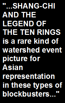 Very much like BLACK PANTHER before it, SHANG-CHI AND THE LEGEND OF THE TEN RINGS - the 25th entry in the Marvel Cinematic Universe - is a bold and rousing step forward for inclusiveness for the MCU, not to mention that it places prominent faith in its characters/world by telling a satisfyingly solid standalone effort that doesn't feel slavish to become a glorified MCU cameo-athon or a placeholder vehicle to expand AVENGERS storylines. There's