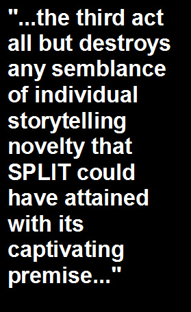 exploitation film like this. And speaking of exploitative, Shyamalan's overall treatment of severe mental illness lacks sensitivity and is about as subtle as a mallet shot to the cranium. Initially, it certainly appears that SPLIT would evolve into a thoughtfully rendered examination of Kevin's fractured psyche and delve into whether or not he's pure evil or an innocent victim of his condition. SPLIT takes some annoying detours in the late stages, some of which involve the supernatural (a Shyamalanian staple), that all but reduces and trivializes Kevin's illness as a simplistic device designed to propel the everything forward to a climax. And this brings me to my biggest issue with SPLIT: its obligatory Shyamalanian twist. Without resorting to spoilers, the third act all but destroys any semblance of individual storytelling novelty that SPLIT could have attained with its captivating premise and instead becomes increasingly ludicrous to stomach, building towards a final pre-end credits epilogue that will have many familiar with Shyamalan's past films either euphorically cheering or maliciously yearning to throw something at the screen in fist pumping protest. I was among