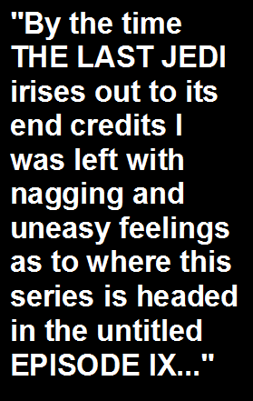 at times. THE LAST JEDI has infinitely more nerve than THE FORCE AWAKENS, probably more than any other STAR WARS film that came before it, and Johnson deserves some props for going clearly against the grain for this series and not backing himself into a corner and relying on old franchise conventions. He clearly loves STAR WARS' massively popular legacy, but is unafraid to contort it to his own dramatic means. That's ballsy. But too much of this inescapably ambitious STAR WARS film is disjointed, messy, rambling, and is replete with so many shocking scripting detours that it feels like it's trying to cram multiple episodes into one. By the time THE LAST JEDI irises out to its end credits I was left with nagging and uneasy feelings as to where this series is headed in the untitled EPISODE IX. THE EMPIRE STRIKES back felt like a compliment to A NEW HOPE while intrepidly pushing STAR WARS into darker new areas of intrigue. THE LAST JEDI neither sincerely compliments nor enhances THE FORCE AWAKENS, because both come off like the product of two filmmakers having divergent and opposing creative end games without a previously established plan of attack and cohesive follow through. In its initial form moving forward, there's most definitely a creative disturbance in the Force with the STAR WARS saga.