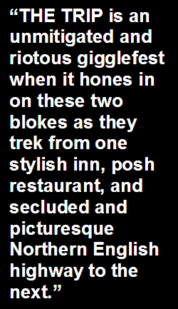 sadness and a sense of regret behind the laughter in this film. Yet, make no mistake about it, THE TRIP is an unmitigated and riotous gigglefest when it hones in on these two blokes as they trek from one stylish inn, posh restaurant, and secluded and picturesque Northern English highway to the next. Winterbottom films the scenery around them with an admirable eye for its bucolic beauty and the food presented within all of their restaurant stops is both mouth-watering and kind of exquisitely artful (don’t watch this film hungry). Yet, THE TRIP is about the ballet of uproarious words between Coogan and Brydon as they try to merrily out-joust the other while taking great relish in it. They also manage to ruminate on the nature of their acting careers in general, but even when their exchanges get serious there is always one of them willing to break the ice. “You can’t treat your entire life like a Radio 4 panel show,” Coogan lectures his buddy. Brydon rolls his eyes and retorts with a “Bzzt!” (indicating an incorrect answer) and states, “ Uh. Yes you can!”