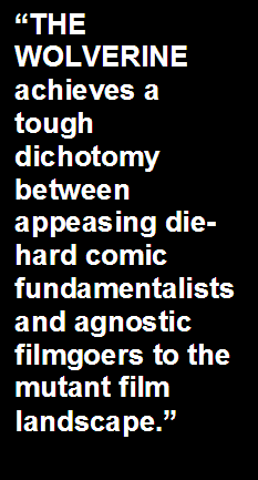 the film hold up and keep the narrative momentum going. THE WOLVERINE is a highly rare breed of summer popcorn fare that places more emphasis of tapping into the fragile mindset of its doomed super hero than it is with big, bloated action and omnipresent special effects. Mangold manages to take a larger-than-life character and populate him in a leaner and more grounded personal storyline of him waging war within his own conflicted psyche. The more obvious comic book film accoutrements are here, to be sure, but THE WOLVERINE achieves a tough dichotomy between appeasing die-hard comic fundamentalists and agnostic filmgoers to the mutant film landscape |