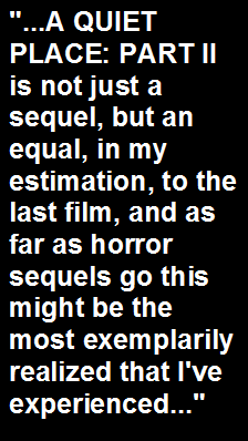 pandemic. It's easy to forget how micro budgeted A QUIET PLACE PART I was (just under $20 million, and it went on to gross nearly $350 million worldwide, making it a bona fide cinematic happening for its time), not to mention how staggeringly effective it was as a pure exercise in nerve wracking terror. Most importantly, though, I screened that film in a packed cinema on day one and it was and still is the only screening that I've attended that had a capacity audience remain virtually silent throughout it's running time. In an era where movie manners and etiquette have hit all time lows, this film was indeed an ultra rare and special commodity. The