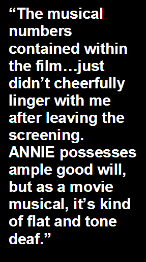 these sequences. Fox and Wallis, though, have extraordinary chemistry and solid vocal range as singers. Wallis gets by considerably on adorably nimble charisma alone and Foxx can play handsome and debonair leading men with socially awkward underpinnings in his sleep. Rose Byrne – even being saddled with a one-note potential romantic suitor role – brings class, dignity, and sweetness to her part. Diaz, regrettably, is so broad and embarrassingly manic that someone should have prescribed Ritalin to her on set. Alas, there’s much to like in ANNIE: its wonderfully necessary multicultural take on the classic character, its noteworthy time period adjustments, its story’s easygoing optimism, and its two lead actors, both of whom are sublimely watchable on screen together. The musical numbers contained within the film, however, just didn’t cheerfully linger with me after leaving the screening. ANNIE possesses ample good will, but as a movie musical, it’s kind of flat and tone deaf. MY CTV REVIEW: |