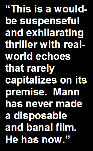 improbably scripted superman would not make it out on top. Then there’s the villain himself, who’s hardly an entity in BLACKHAT at all, and when he reveals himself he’s basically a megalomaniac with world dominating aspirations on pure autopilot (he’s also no physical match for the perpetually brawny Hemsworth, which makes their climatic standoff all the more dull). I’m really ashamed of BLACKHAT, especially coming from Mann, who has made an acclaimed career of making cold and calculating action thrillers with merciless pacing and a fine attention to character detail. Yet, everything in BLACKHAT just falls resoundingly flat. This is a would-be suspenseful and exhilarating thriller with real-world echoes that rarely capitalizes on its premise. Mann has never made a disposable and banal film. He has now. |
