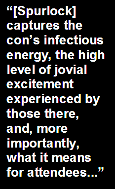 does not try to sermonize a self-congratulatory agenda here. Seeing his name on the credits I was expecting Spurlock to scathingly mock the geek culture of the con devotee, but instead he completely reins himself in and just treats the event with a straightforward and earnest appreciation. He captures the con’s infectious energy, the high level of jovial excitement experienced by those there, and, more importantly, what it means for attendees from all walks of life to feel like they’re accepted when people outside of the event have different ideas. COMIC-CON is not a documentary of grand ideas or soul-searching analysis of why this event has become so unfathomably huge in recent memory; instead, it pays homage to the Comic-Con spirit by making you feel like you are there among the other hundreds of thousands. For the five days during which the con takes over San Diego, the geeks there do in fact inherent and rule over the earth...and that’s not a bad thing |