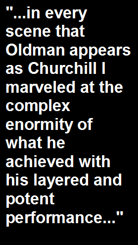 support. The largest takeaway from DARKEST HOUR is how it shows Churchill's indomitable spirit and how using the power of words and patriotic rhetoric - when other tangible resources were in short supply - let him rally a country together to face off against a seemingly unbeatable tyrant. If anything, Churchill inspired people by his mere presence and gritty determination alone, and at a time when it seemed unlikely that a victory over Germany was at all a possibility. There's an intense dramatic urgency on display throughout DARKEST HOUR, which allows for it to become so hypnotically enthralling during its two hours. And in every scene that Oldman appears as Churchill I marveled at the complex enormity of what he achieved with his layered and potent performance. Watching all future Churchill inspired films going forward with different actors quarterbacking it all will be mightily difficult; DARKEST HOUR deserves its esteem as a benchmark war drama about one of the UK's greatest leaders. |