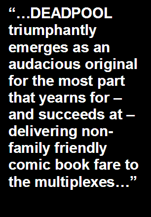Right out of the gate, DEADPOOL emphatically states its case for being in a whole other league apart from not only other Marvel films, but also from all other films based on costume clad crusaders of justice…period. It’s a film that gleefully and perversely wears its R-rating like a proud badge of honor, but DEADPOOL is certainly not the only hard-edged and adult-content laced comic book film to have graced the cinemas (WATCHMEN, THE CROW, the two PUNISHER films, just to name a few) and its certainly not the first to cheekily send up the whole genre with a subversive wink-wink delight (KICK-ASS). Yet,