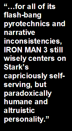 if it didn’t manipulate its audience as it does. I guess that the film would have benefited more from the Mandarin’s more palpably scary level of zealot-like menace, seeing as Aldrich’s Extremis-juiced-up baddies seem more out of fantastical left field. The first IRON MAN film tapped into a level of societal skepticism of political forces – both good and bad – that shape the world at large, which would have made the Mandarin all the more frightening. Yet, for all of its flash-bang pyrotechnics and narrative inconsistencies, IRON MAN 3 still wisely centers on Stark’s capriciously self-serving, but paradoxically humane and altruistic personality. There is a sense of closure to this IRON MAN story, which makes sense seeing as Downey has frequently postulated that this would be his last turn as Stark. However, seeing what a massive financial juggernaut this series has become, making fans believe that the future of IRON MAN will be a Downey-free endeavor is a sleight of hand deception that would make the crafty Stark blush with envy. |