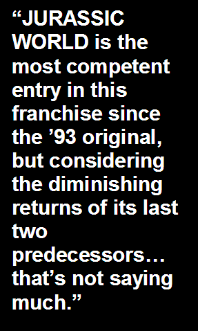than genuinely frightening. JURASSIC WORLD leaves things open ended for more sequels, which left me feeing hollow inside. Where could they possibly take this series next? No one character in this film (with the possible exception of Pratt’s pragmatic Owen) has learned anything from the ill deeds of past characters in JURASSIC PARK I through III. At one point in the film Owen sheepishly states, “These people never learn.” That’s telling not only of the scientists and theme park managers residing in the film, but also of the larger film industry as a whole. More JURASSIC PARK films will be made in this entry’s wake, even at a risk of straining premise credulity and artistic necessity. JURASSIC WORLD is the most competent entry in this franchise since the ’93 original, but considering the diminishing returns of its last two predecessors…that’s not saying much. |