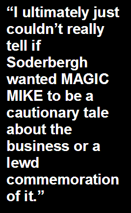 MAGIC MIKE was essentially critic proof. As for the rest of us more scrutinizing male viewers, this is