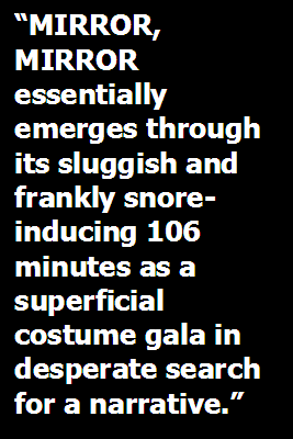 an ass of himself. Perhaps the biggest and most shocking revelation of MIRROR, MIRROR is that it was directed by Tarsem Singh (sometimes going by the moniker "Tarsem"), who made for my money one of the greatest looking films of the last decade in THE FALL (a vastly better film with fairy tale trappings) and has made a stellar career as one of the cinema’s pre-eminent visual storytellers. Yet, his unorthodox aesthetical eccentricities and swaggering flare have gone missing in MIRROR, MIRROR as he becomes a slave to the film’s annoyingly jokey and juvenile tone and its parade of eye-gasmic costumes and sets; he just seems to be dutifully phoning in these egregious elements. A treatment of the ageless story of Snow White certainly deserves Tarsem’s unique skill set, but MIRROR, MIRROR betrays them entirely. It’s a wondrously good-looking, but a stiff, lifeless, banal, and frankly disinteresting appropriation of Grimm’s original creation. MIRROR, MIRROR is