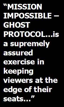The real mission:impossible behind the film, though, may be the fact that Oscar winner Brad Bird – making his live-action directorial feature film debut after an auspicious career of making animated efforts like RATATOUILLE, THE INCREDIBLES, and THE IRON GIANT – has managed to take a franchise that, under normal circumstances, would be stale by its fourth entry and instead has injected a revitalizing sense of freshness and daring innovation into the proceedings. The first three MISSION films were solid: I liked the Euro-aesthetic of Brain De Palma’s 1995 original, the high octane intensity of John Woo’s 2000 follow-up, and J.J. Abrams brazenly stylish, merrily improbable and engaging M:I-III from 2006. Yet, Bird’s newest entry sets an audacious new standard for the series. Some action films
