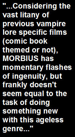pure autopilot in their final act. Of course, because MORBIUS is meant to be a bridging vehicle between the Disney controlled MCU and Sony helmed Spidey cinematic universes. There's a tacked on and routine mid-end credits sequence that - without going into spoilers - attempts to ride in on the coattails of the multiverse narrative of SPIDER-MAN: NO WAY HOME by featuring a cameo that - when you modestly pick apart the established MCU mythology that has been set up - makes no sense whatsoever. Maybe that's my largest misgiving with MORBIUS: Instead of trying to stand proudly on its own two feet as a unique standalone entry, Sony is just attempting to suck on the exhaust fumes of the success of the last SPIDER-MAN picture, and it really shows here. I'll say that MORBIUS, to its credit, is no where near as putrid as all of the pre-release chatter online has led you to believe. I think the central character is well played by Leto and his world has so much untapped promise that's regrettably never fulfilled in the final product. Plus, I found it to be significantly more engaging on a conceptual level than the last VENOM sequel, which I found to be insufferable to sit through. But, yeah, MORBIUS is still kind of a mess, but an interesting mess that has a certain generic and vanilla plain entertainment value. Considering the vast litany of previous vampire lore specific films (comic book themed or not), MORBIUS has momentary flashes of ingenuity, but frankly doesn't seem equal to the task of doing something new with this ageless genre. Like too many on-brand comic book movie extravaganzas, it feels copied and pasted from a factory assembly line playbook. And pondering just how long it took MORBIUS to make it to cinemas (it was a victim of constant pandemic related release re-scheduling), it feels oddly incomplete and unfinished. Still, I doubt that waiting another year would have fixed this somewhat doomed production any more. |