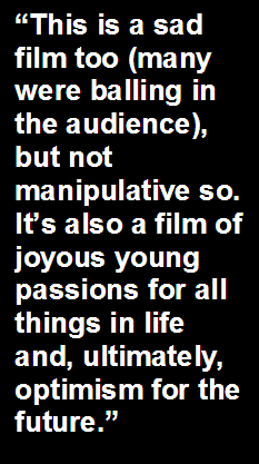 looking for someone to date. Oh…and a little bit of Paul Rudd goes an awfully long way too. He plays an English teacher and caring mentor figure to Charlie that inspires him to read classics and find his own literary voice (how nice is it to see high school teachers shown as good, nurturing, and compassionate figures in films like these?). I guess I found THE PERKS OF BEING A WALLFLOWER so atypically refreshing in most regards; it’s not dime-a-dozen teen angst drivel, nor is it a squeaky clean portrayal of adolescent mental illness or emotional restlessness. Chbosky shows a remarkably assured hand at balancing all of the film’s themes of social introversion, identity crisis, and coming to grips with a damning past that always seems to hurt one in the present. This is a sad film too (many were balling in the audience), but not manipulative so. It’s also a film of joyous young passions for all things in life and, ultimately, optimism for the future. In the end, I was surprised by how much THE PERKS OF BEING A WALLFLOWER moved me and the perks of seeing it are many. |