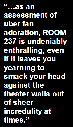 ways that not many films are able to. In the end, I just wished that the doc had a more wide-ranging exploration of opinions; it seems to specifically cherry pick the most outrageous and disregards the rest. Yet, as an assessment of uber fan adoration, ROOM 237 is undeniably enthralling, even if it leaves you yearning to smack your head against the theater walls out of sheer incredulity at times. I saw the film as the first part of a double feature that had a screening of THE SHINING that followed it. ROOM 237 made me giddily excited for exploring THE SHINING again, which might be its ultimate end-game. Did I leave my latest viewing of it thinking that Kubrick was using it to apologize for his complicity in hiding his knowledge of counterfeiting the Apollo moon landings, though? No. Chance. In. Hell. |