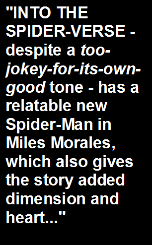 humor. I've read a few other critics that have essentially labeled INTO THE SPIDER-VERSE as the PG love child of DEADPOOL and THE LEGO MOVIE. That seems pretty apt, and is one of the sources of, in my opinion, its biggest weakness. However, that's not to take away from the other audacious choices that make this film work, like its supremely pioneering and intrepid visual design and a noble minded attempt to give viewers a SPIDER-MAN film that's delectable different from all others that have come before. Best of all, INTO THE SPIDER-VERSE - despite a too-jokey-for-its-own-good tone - has a relatable new Spider-Man in Miles Morales, which also gives the story added dimension and heart, the latter trait that frequently gets ignored a lot of other bloated and self-indulgent comic book films. |
