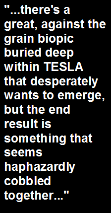 film he occupies. That's all too bad, because there's a great, against the grain biopic buried deep within TESLA that desperately wants to emerge, but the end result is something that seems haphazardly cobbled together and lacking in cohesion. Again, there's nothing wrong with a film that flips the bird to genre troupes (I like filmmakers that challenge tired formulas), but TESLA just lacks - pardon the obvious pun - that ethereal spark of dramatic innovation. Nikola Tesla was indeed a rule breaker and a maverick scientific mind that shunned established status quos. He rebelliously thought outside of the box, but his risks rarely led to rewards, which might be why he became relatively penniless and had his work become a footnote in history when he died in 1943 (it was only in the subsequent decades afterwards where a greater understanding of his work became more appreciated, especially in relation and comparison to Edison). Tesla demands a better biopic than this fearlessly experimental, but in due course undisciplined and unfocused film here. Much like the historical man in question when he left this earth, TESLA will fall into relative and forgettable obscurity very quickly after being screened for most. |