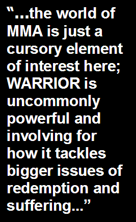 Very few fight-based films have taken such arduous pains to understand the fragile and tortured mindsets of both opponents in the ring at its conclusion, but WARRIOR is one of those highly rare breeds. It's those very reasons that make it rise triumphantly above its more routine elements. |