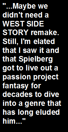 Maybe we didn't need a WEST SIDE STORY remake. Still, I'm elated that I saw it and that Spielberg got to live out a passion project fantasy for decades to dive into a genre that has long eluded him, and he does so here with a nearly unmatched prowess and consummate polish. WEST SIDE STORY is also a prime example of how a revered classic of yesteryear can be given proper and renewed lease on life with an exemplarily handled remake helmed by just the right passionate filmmaker. |